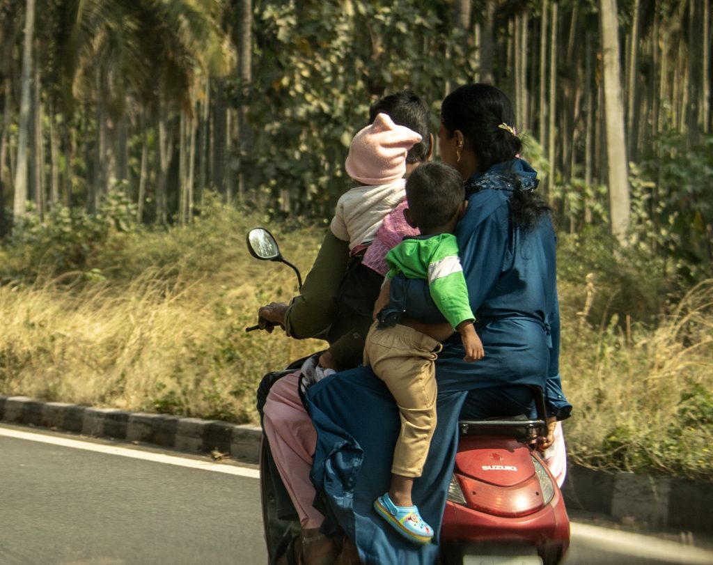 Φύγαμε για Bengaluru και στον δρόμο με εντυπωσίασε αυτό το σκούτερ, καθώς ανάμεσα στο ζευγάρι κάθονται δύο παιδιά, ενώ η μητέρα κρατάει ένα ακόμα παιδί στο αριστερό της χέρι. Το ανατριχιαστικό ήταν ότι έκανε σφήνες μέσα στην κίνηση, και προσπεράσματα στον κεντρικό δρόμο, πηγαίνοντας πραγματικά γρήγορα.
