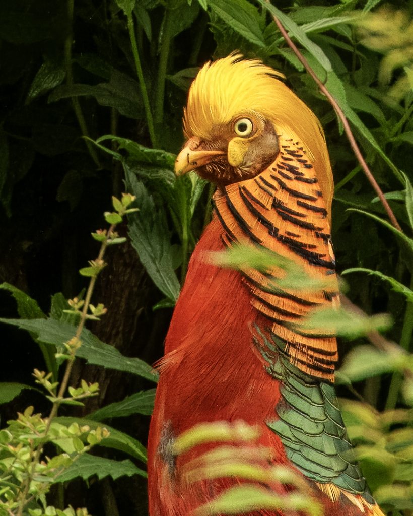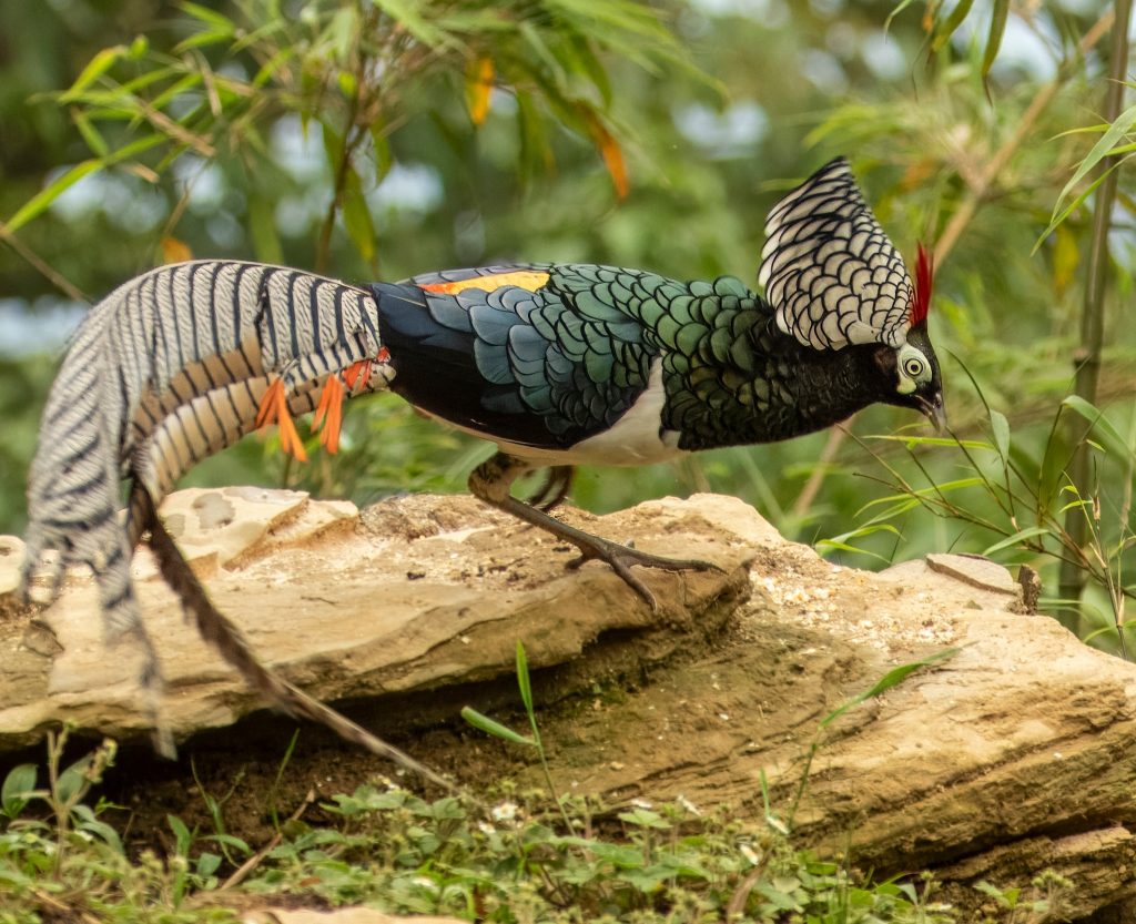 Lady Amherst’s pheasant. Ο πιο κοκκέτης φασιανός. Δείτε τα πορτοκαλί φτεράκια που πετάγονται στην αρχή της ουράς του.