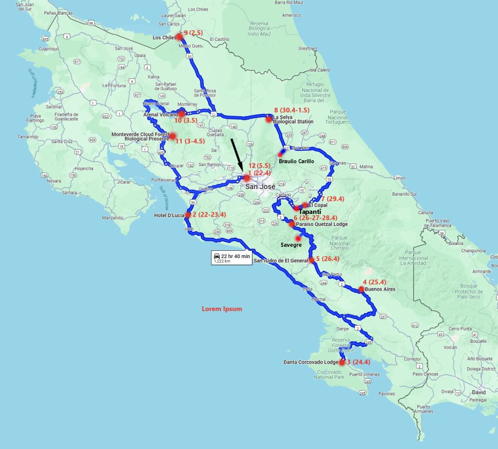 Διασχίσαμε την ανατολική ακτή για τα caribian side πουλιά και την δυτική για τα pacific side. Τέρμα βόρεια για πουλιά που μοιράζεται η Κόστα Ρίκα με Νικαράγουα και τέρμα νότια, για όσα μοιράζεται με Παναμά.