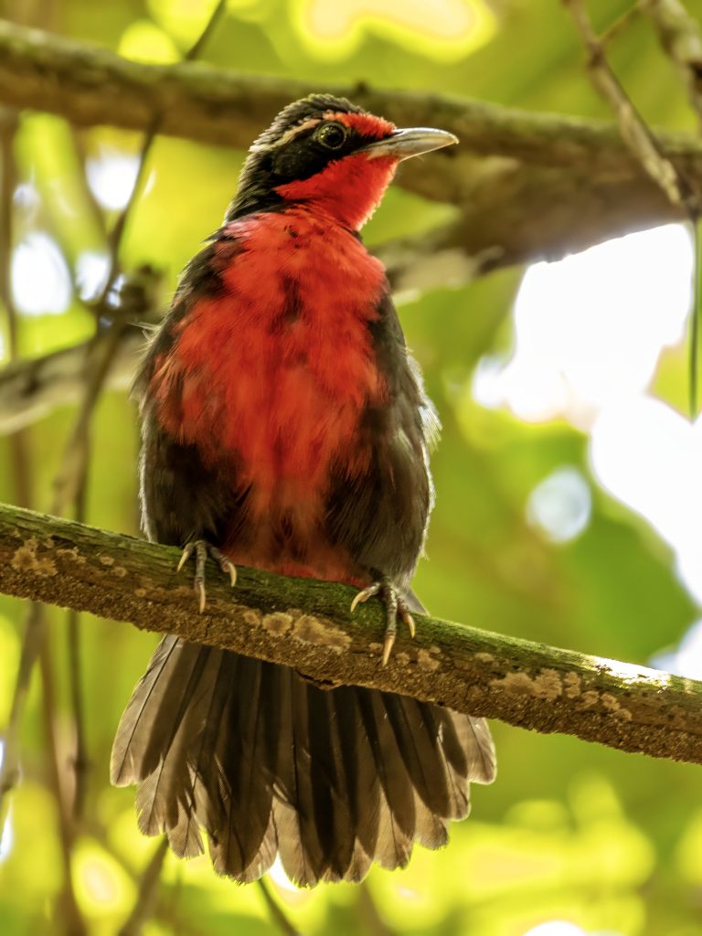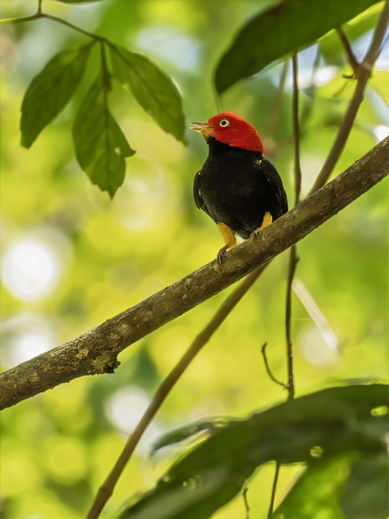 Κατά τις 10:00 βρεθήκαμε σε ένα άλλο σημείο. Στρίψαμε από τον κεντρικό δρόμο σε έναν πλαϊνό, παρκάραμε και περπατήσαμε καμιά εκατοστή–150 μέτρα και είδαμε 21 είδη εκεί, μονοκοπανιά. Ανάμεσά τους το Red-capped Manakin ψηλά στα δέντρα
