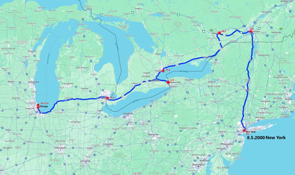 Αργά το μεσημέρι ξεκινήσαμε για να καλύψουμε τα 200 χιλιόμετρα μέχρι το Vancouver. Η διαφορά ώρας με την Ελλάδα είχε πλέον φτάσει τις δέκα ώρες και τα κινητά μας, από το Chicago και μετά, είχαν πάψει να λειτουργούν. Από εκεί και πέρα θα χρησιμοποιούσαμε μόνο τα δύο δορυφορικά τηλέφωνα, ένα σε κάθε αυτοκίνητο.