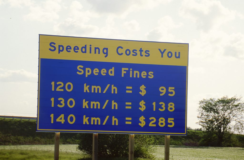 Καθ’ οδόν βλέπαμε διαδοχικές πινακίδες που ενημέρωναν για τα πρόστιμα ανάλογα με την ταχύτητα: στα 120 χλμ./ώρα 95 δολάρια, στα 130 χλμ./ώρα 138 δολάρια και στα 140 χλμ./ώρα 285 δολάρια.