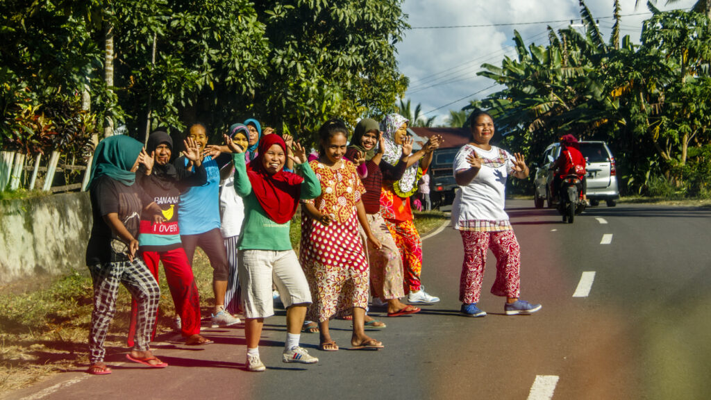 Φτάνοντας είδαμε κόσμο (κάποιοι ήταν μασκαρεμένοι), στο δρόμο να κάνει πρόβες για την μέρα της ανεξαρτησίας της Ινδονησίας, που ήταν σε 2 μέρες.
