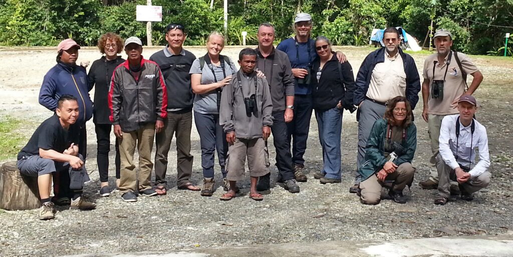 Στη φωτογραφία, απο αριστερά, ο υπέροχος “fixer” Jonas Siwy. Κανόνιζε πράγματα, που δεν πίστευες οτι γίνονται. Στην συνέχεια οι 2 φύλακες του πάρκου και ο οδηγός του αυτοκινήτου μας και ανάμεσα τους η Barbara Hirst. Ακολουθούν το ζευγάρι Sheila και Mark Curley, που μένανε στην Ιαπωνία, έχοντας ανάμεσα τους τον Idre, που ήταν ο local bird guide του Lore Lindu. Ακολουθούν ο πολυ καλός birder Paul Lufkin, που ήταν μαζί με την Dawn Brown, που ενδιαφερόταν για πεταλούδες και ζουζούνια και όχι για πουλιά.