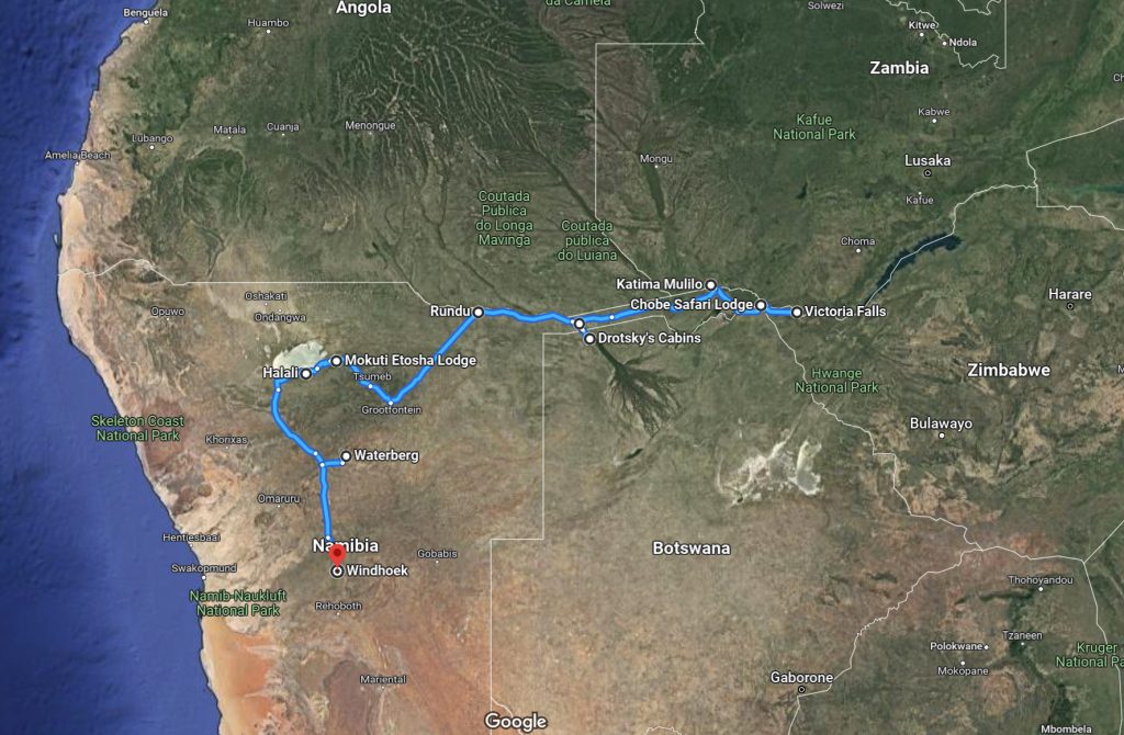Είχα λίγο χρόνο πριν την αναχώρηση και κοίταζα τον χάρτη της διαδρομής. Το ταξίδι ξεκινούσε από τη Ζάμπια, στην περιοχή των Victoria Falls. Από εκεί θα περνούσαμε τον ποταμό Ζαμβέζη και στη συνέχεια θα διασχίζαμε για περίπου 450 χιλιόμετρα το Caprivi Strip, μια στενή (έχει 35 χλμ. πλάτος) λωρίδα γης που ανήκει στη Ναμίμπια και εκτείνεται πάνω από τη Μποτσουάνα και κάτω από την Αγκόλα και την Ζάμπια.