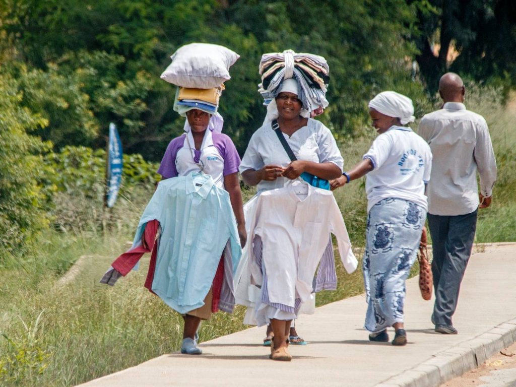 Τα πουκάμισα κρεμασμένα μπροστά τους, τα υπόλοιπα ρούχα στοιβαγμένα στο κεφάλι. Με χαμόγελο στα χείλη βγάζουν το μεροκάματο, στον δρόμο προς τους καταρράκτες της Βικτώρια, στο Livingstone.