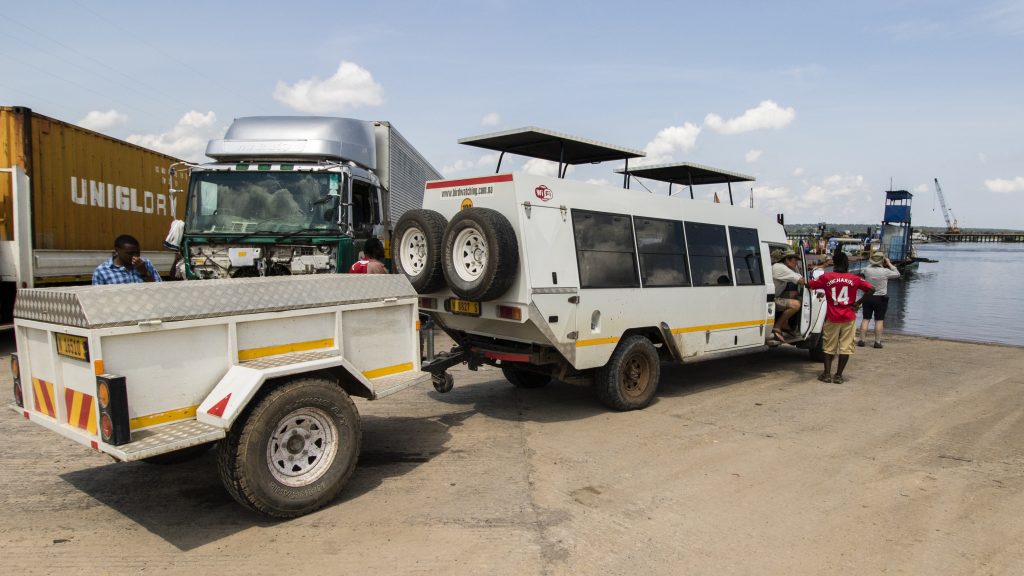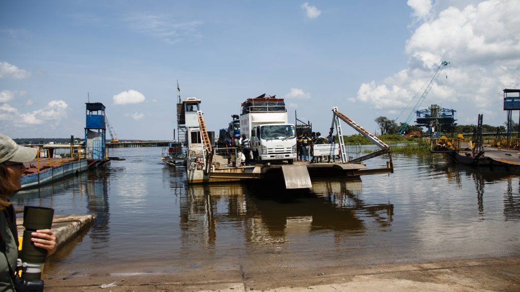Φορτηγά, σαφάρι οχήματα, τοπικά λεωφορεία και πεζοί περιμένουν υπομονετικά τη σειρά τους στην όχθη. Όταν ήρθε η σειρά μας, το βαρύ Land Cruiser κύλησε πάνω στη μεταλλική πλατφόρμα και το φεριμπότ ξεκίνησε αργά να διασχίζει τον ποταμό.