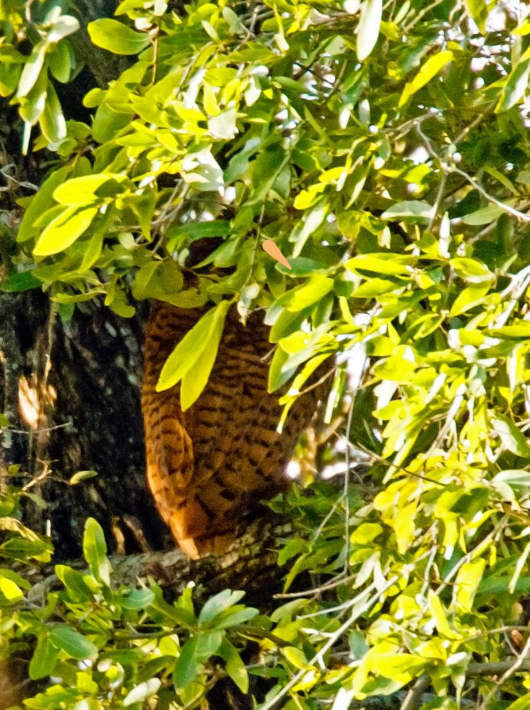 Η μεγάλη στιγμή, όμως, ήρθε τη νύχτα. Αφού είχαμε ήδη πάει για ύπνο, ακούσαμε έξω μια κουκουβάγια να καλεί. Βγήκαμε και στο δέντρο ακριβώς μπροστά στο δωμάτιό μας βρισκόταν μια Pearl-spotted Owlet, κρατώντας το ποντίκι που μόλις είχε πιάσει.