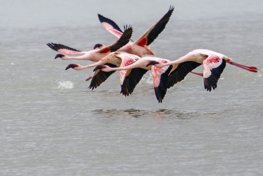 Σε μια ρηχή λεκάνη νερού συναντήσαμε Lesser Flamingos και σταθήκαμε τυχεροί: εκείνη τη στιγμή απογειώθηκαν όλα μαζί, δημιουργώντας μια εντυπωσιακή ροζ έκρηξη κίνησης πάνω από το λευκό τοπίο.