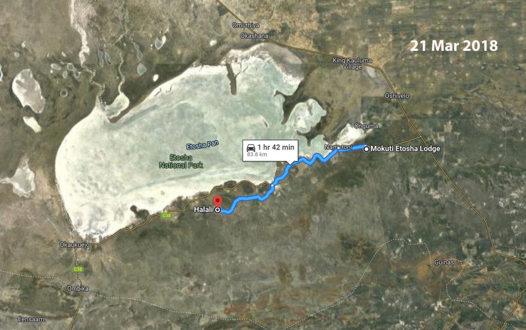 Ήταν η μέρα που αλλάζαμε camp. Αφήσαμε το Mokuti Etosha Lodge, που βρίσκεται στην άκρη της Etosha National Park, και κατευθυνθήκαμε περίπου 85 χιλιόμετρα δυτικότερα προς το Halali Camp, σχεδόν στο κέντρο του πάρκου.
