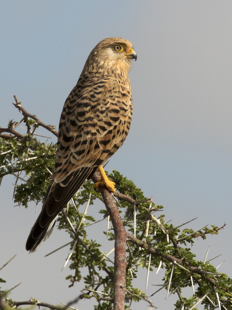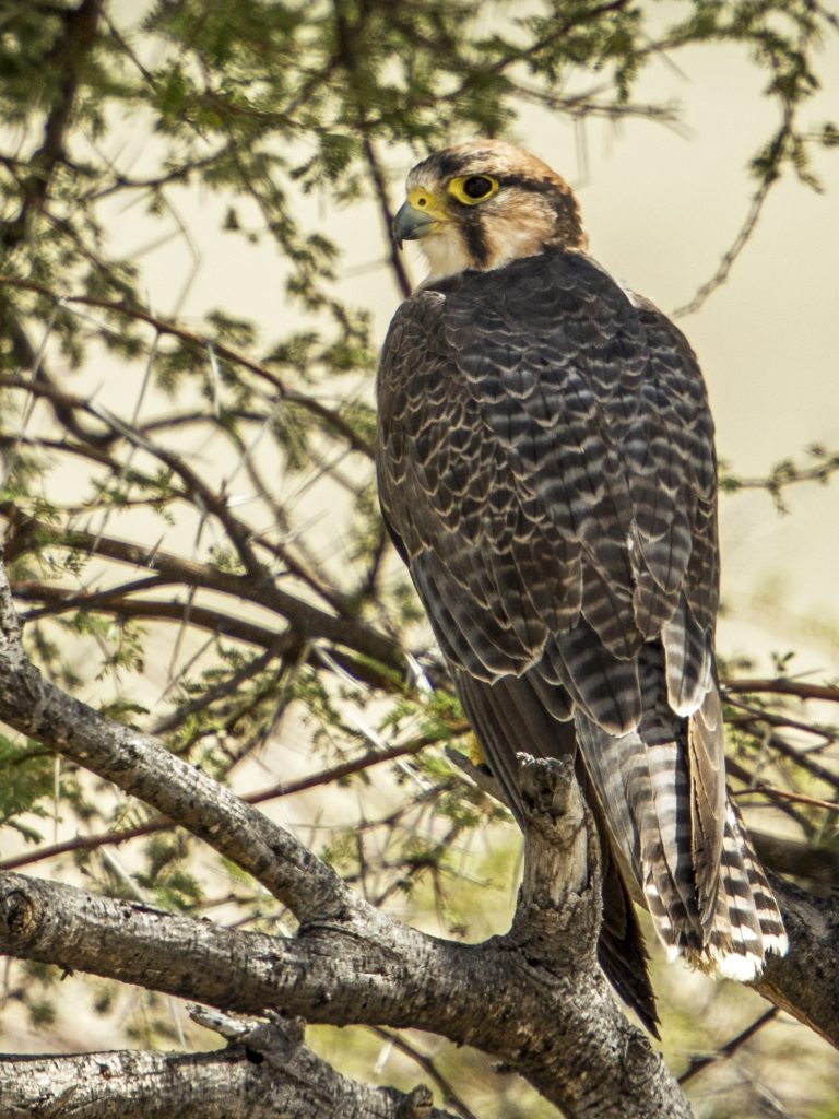 Λίγο έξω από την Etosha είχαμε μια από τις πιο όμορφες συναντήσεις της ημέρας: ένα Greater Kestrel στεκόταν κοντά στον δρόμο και μας έδωσε την ευκαιρία για εξαιρετικές φωτογραφίες. Είναι αρπακτικό που ζει κυρίως στη νότια Αφρική, από τη Ναμίμπια και νοτιότερα, οπότε η κοντινή αυτή παρατήρηση ήταν πραγματικά σημαντική.