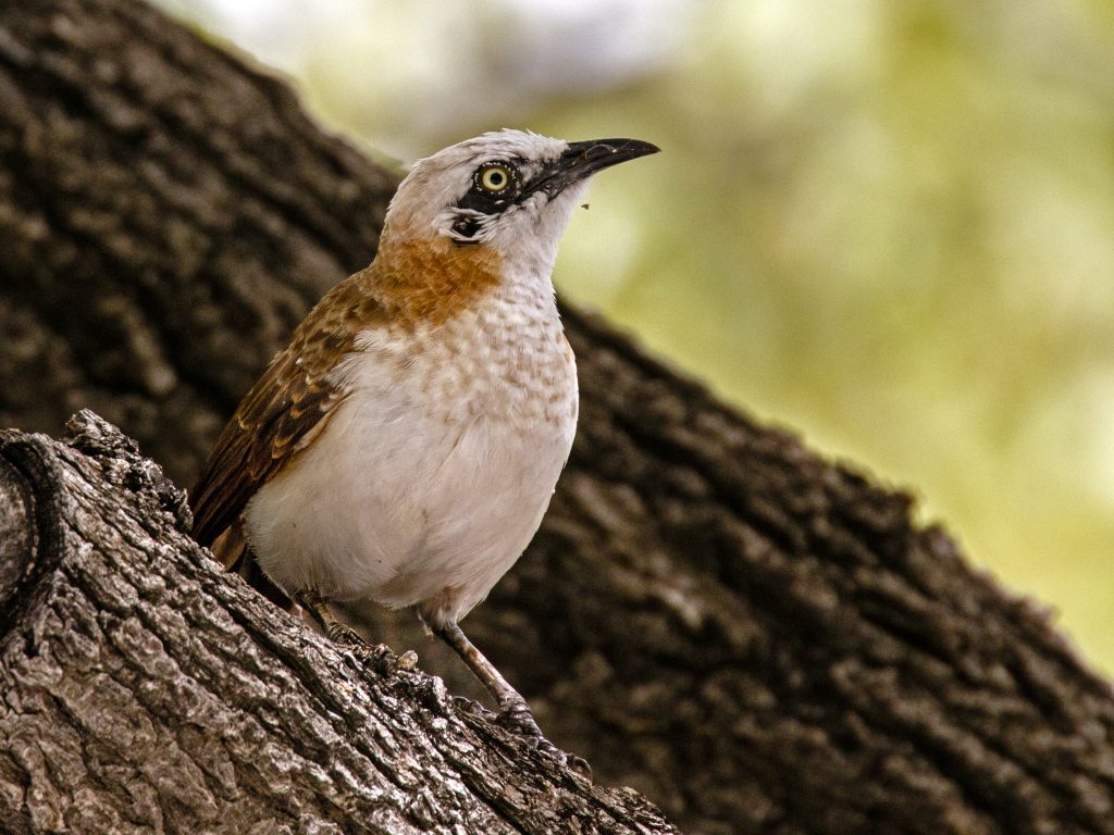 Η Λουκία βγήκε για birding στους κήπους και σύντομα εντόπισε και φωτογράφισε μια Southern Pied Babbler. Το είδος αυτό έχει την εντυπωσιακή συνήθεια να αφήνει έναν «φρουρό» σε ψηλό σημείο για να επιτηρεί κινδύνους, ενώ το υπόλοιπο κοπάδι ψάχνει τροφή στο έδαφος. Η Λουκία βρήκε και απαθανάτισε ακριβώς αυτόν τον φρουρό. Το συγκεκριμένο είδος ζει μόνο σε αυτό το μικρό τμήμα της νοτιοδυτικής Αφρικής.