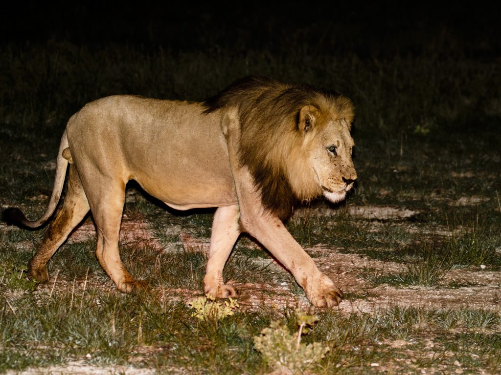 Ξεκινήσαμε γύρω στις 9. Στην πρώτη κιόλας στάση ζήσαμε κάτι αξέχαστο: μια αγέλη λιονταριών κινούνταν στο σκοτάδι και μας πλησίασε στα πέντε μέτρα. Ένα υπέροχο αρσενικό πέρασε δίπλα από το όχημα, αδιάφορο για την παρουσία μας.