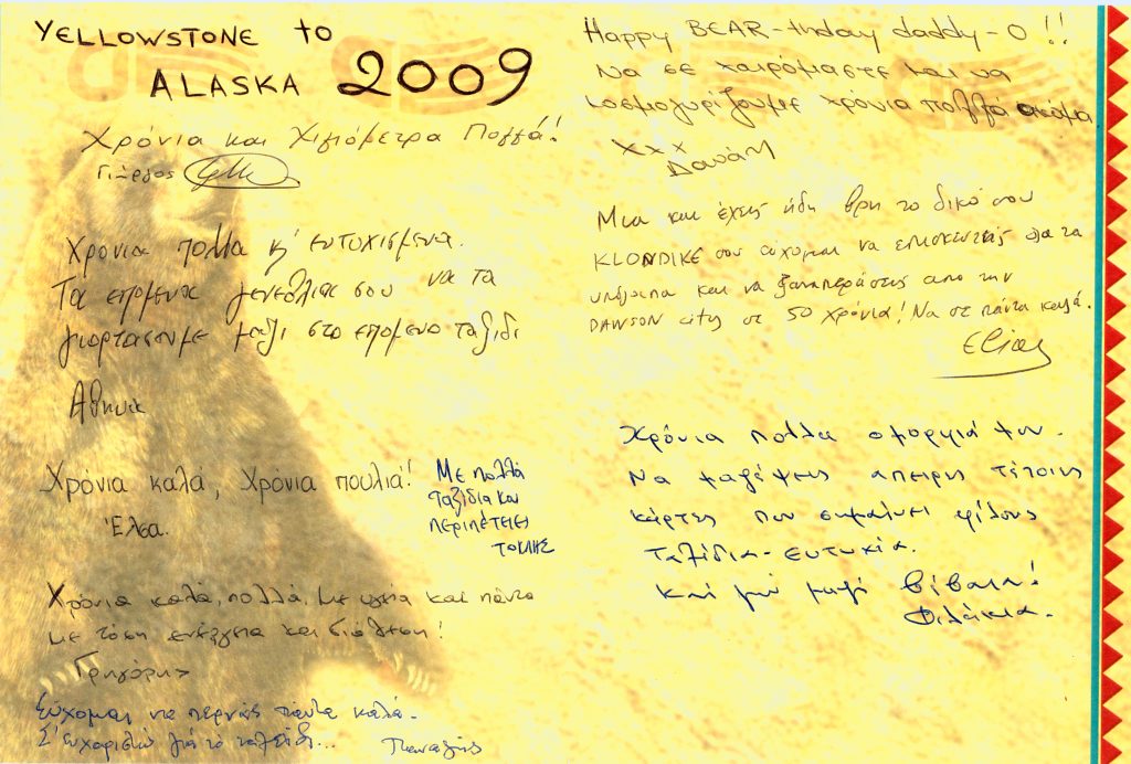 Χρειάζονται ώρες για να περιγράψεις σε κάποιον όσα ζήσαμε σε αυτό το ταξίδι. Ήταν πραγματικά μια συναρπαστική εμπειρία. Τόσες διαφορετικές εικόνες: από το Yellowstone, στον Alaska Highway, στην κρουαζιέρα για το Juneau, στον Dempster Highway, στο Katmai National Park και στην κρουαζιέρα με τον τεράστιο παγετώνα.