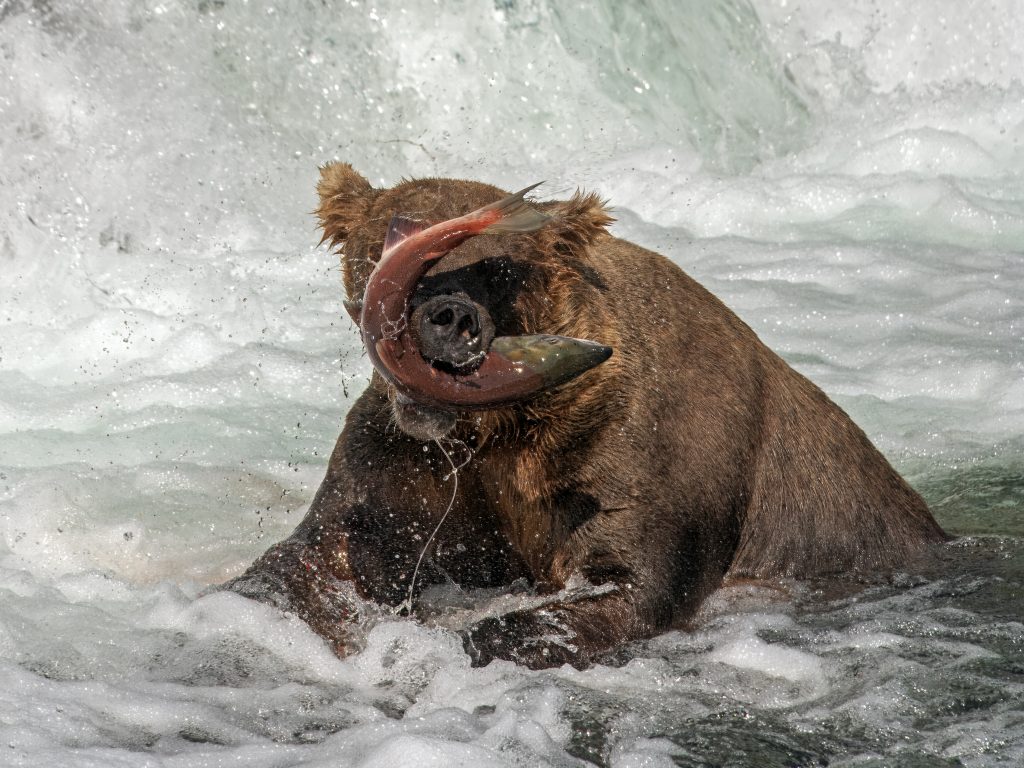 Σε ορισμένα σημεία του καταρράκτη κάθονταν δύο ή τρεις μεγάλες αρκούδες. Όποια αρκούδα καταφέρει να σταθεί εκεί, έχει και τις περισσότερες πιθανότητες να πιάσει σολομούς. Οι υπόλοιπες βρίσκονταν πιο πίσω, προσπαθώντας να κυνηγήσουν μέσα στο ποτάμι, κάτι πολύ πιο δύσκολο. Στα «καλά» σημεία, οι αρκούδες έπιαναν τους σολομούς κυριολεκτικά στον αέρα.